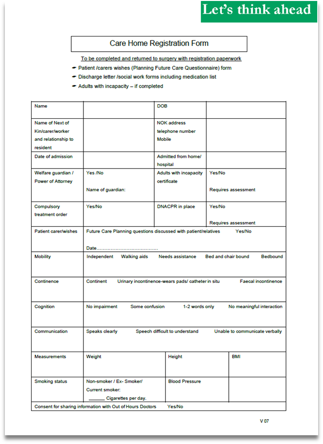 The care home registration form (previously referred to as Document 2) is how you share information for registering new residents with the GP practice. This information also populates the electronic future care plan-KIS at the GP practice. You may have your own version of this form.