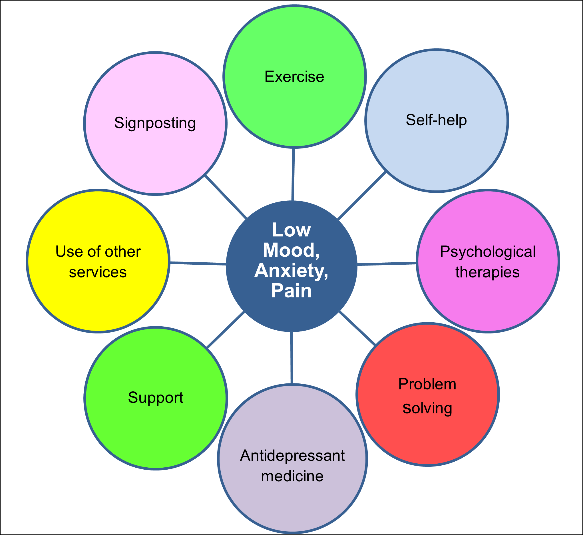 While a range of activities may help with common mental health problems and pain management, these will vary with individuals’ preferences, capabilities, and locality. Some of the following may be appropriate and should be considered and discussed before initiating an antidepressant, as well as when continuing an antidepressant for more severe illness. Where appropriate and available, a Community Link Worker may be able to support and enable individuals to access or develop some of the options below.