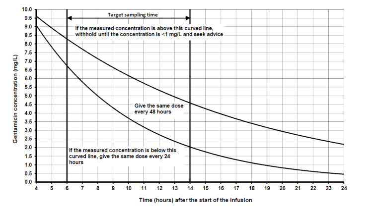 - If the patient weighs less than 40kg and CrCl is >21ml/min, give a single dose of 5mg/kg, then monitor as below.