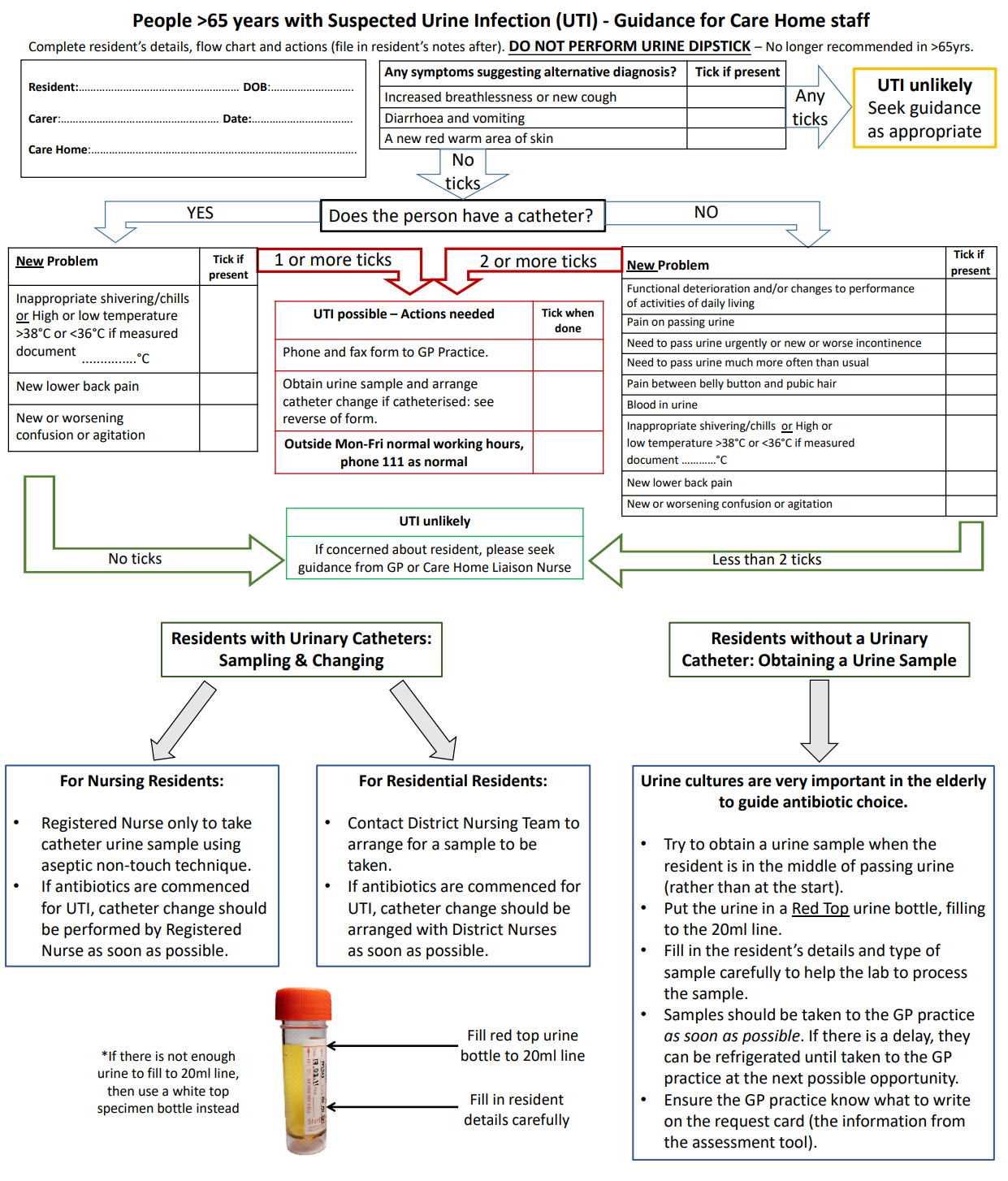 This section provides a data gathering form and flowchart for care home staff to help them to identify symptoms of potential Lower Urinary Tract Infection and take appropriate action. The guidance has been developed by Healthcare Improvement Scotland and the Scottish Antimicrobial Prescribing Group. This guidance is intended to be used by all care home staff – including nursing and non-nursing staff.