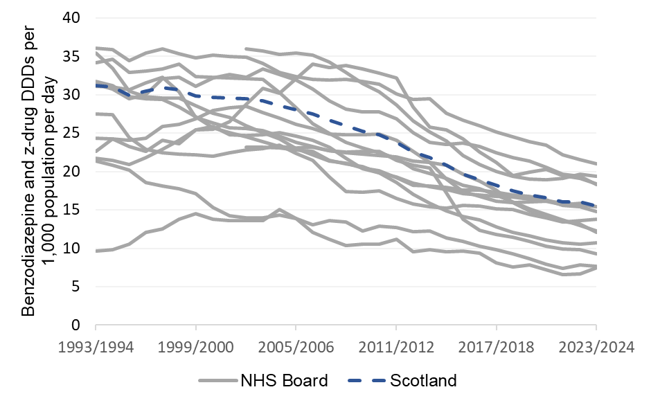 Chart 1: NHS board benzodiazepine and z-drug prescribing by defined daily dose (DDD*) per 1000 list size per day