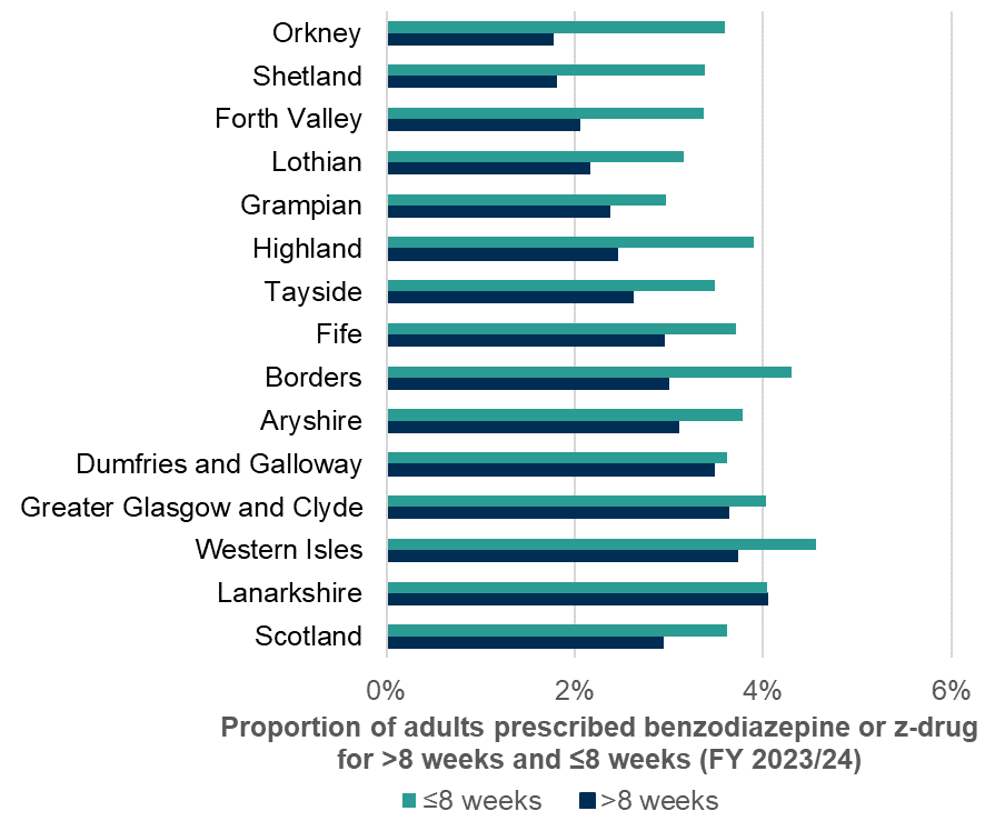 Chart 2: Proportion of adults prescribed a benzodiazepine or z-drug (B-Z) for 8 weeks or less, or longer than 8 weeks, by NHS board, Scotland 2023/24