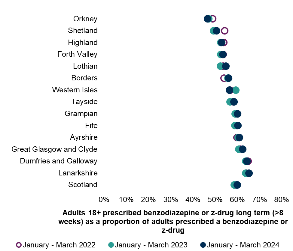 B-Z prescribing has reduced over the years in Scotland (see Chart 1, below)). Chart 2 shows less than 6% of adults receiving B-Z in 2023/24. Long-term (≥8 weeks) use remains common with over 40% of adults receiving B-Z remaining on treatment long-term (Chart 3 Jan-March 2024). This is outwith medicine licensing and runs contrary to current guidelines and prescribing advice.5,13,15