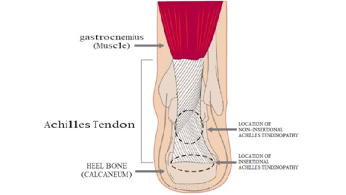 Non-insertionalAchilles tendinopathy: This is the most common injury to the Achilles and affects the tendon around 2 to 6cm above where it attaches onto the back of the heel bone.
