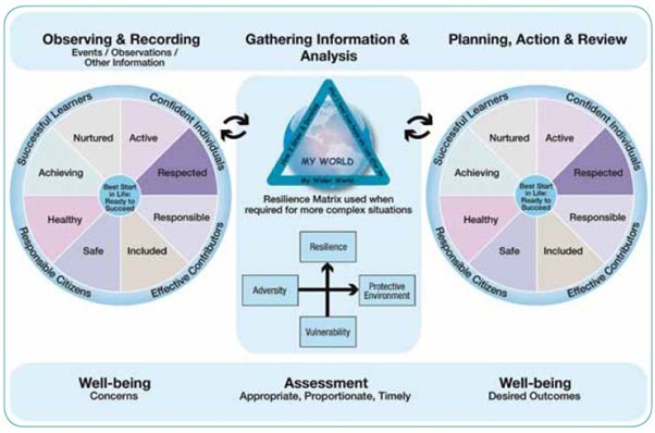 The Practice Model diagram summary below brings together the My World Triangle, Resilience Matrix, wellbeing indicators (SHANARRI) and the four contexts for learning within Curriculum for Excellence, to support overall assessment. It is intended to provide a structure to support practitioners, working together with children, young people and families, to make effective use of assessment information. This information will likely have been gathered from multiple sources, including regular information gathering processes on the progress of a child or young person with full participation from the child or young person.