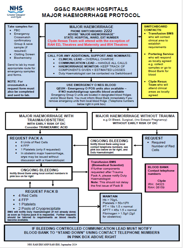 A printable copy of the RAH/IRH Major Haemorrhage Protocol Flowchart is available here