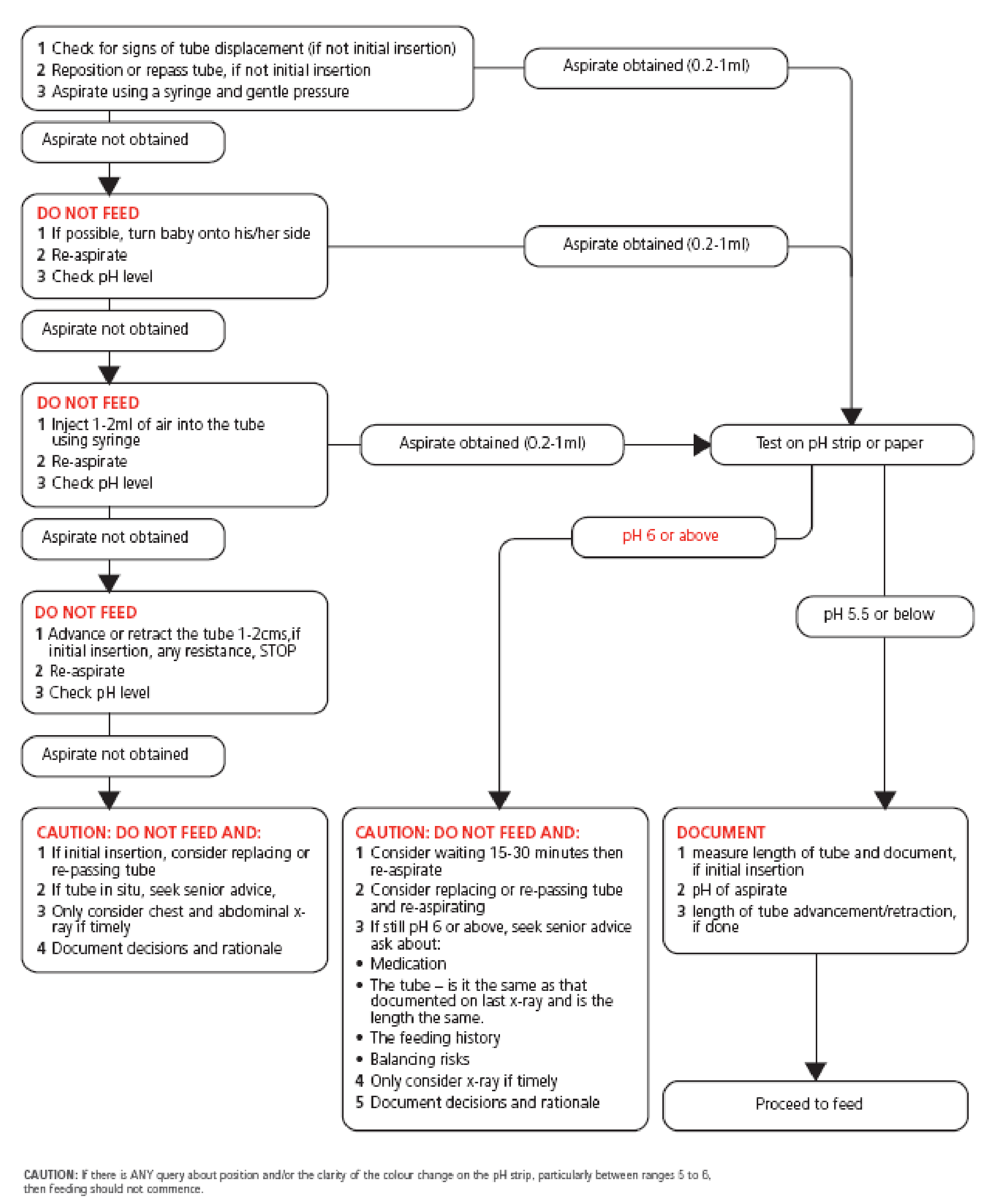 Flowchart taken from: National Patient Safety Agency (2005). Reducing the harm caused by misplaced gastric feeding tubes in babies under the care of neonatal units. (Interim advice note: NRLS-0223A).