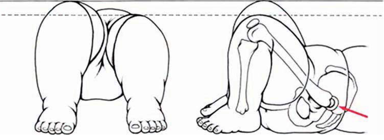 The hips should be fully flexed and abducted together, to detect any difference between the sides. The examiner's middle fingers are placed on the greater trochanter with the flexed legs contained in the palms. The thumbs rest on the inner side of the thighs opposite the lesser trochanter. Even slight limitation of abduction may be significant, indicating a hip that is starting to subluxate. Asymmetry or reduction of hip abduction of the hip in a neonate is a trigger for a hip ultrasound.