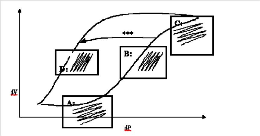 Figure 6: Pressure volume relationship in the lung demonstrating different stages of lung inflations as detailed below as Point A,B,C and D