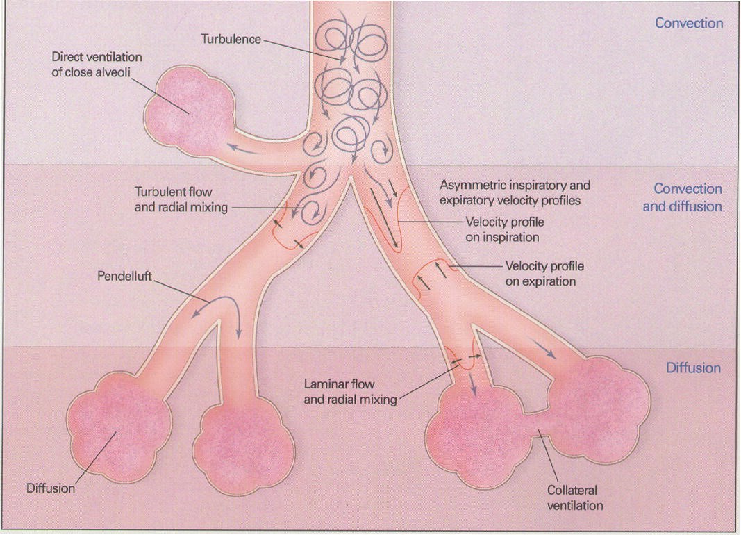 - Augmented (Taylor) dispersion - In the lungs, the branching network of the airways together with Pendelluft movement, leads to gas turbulence and mixing between the core and the periphery of the gas column and radial dispersion is eliminated. This results in greater gas mixing with lower tidal volumes.