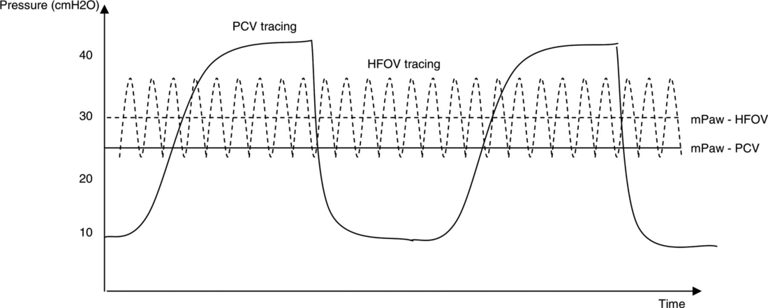 It is important to appreciate that in HFOV the pressures set at the ventilator and delivered at the ET tube are not the same as those reaching the alveoli. Approximately 10% of the ΔP (amplitude) delivered at the endotracheal tube is transmitted to the terminal bronchioles and alveoli, compared with 90% of PIP transmission during conventional ventilation (Figure 3)