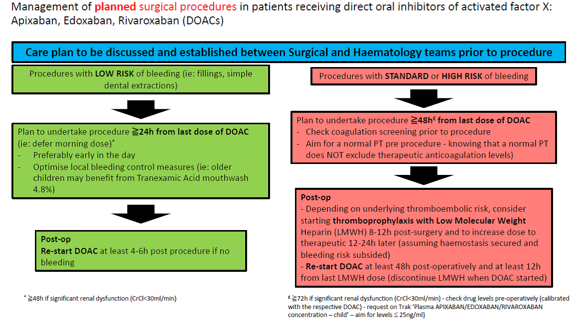 Management of planned surgical procedures in patients receiving direct oral inhibitors of activated factor X: Apixaban, Edoxaban, Rivaroxaban (DOACs):