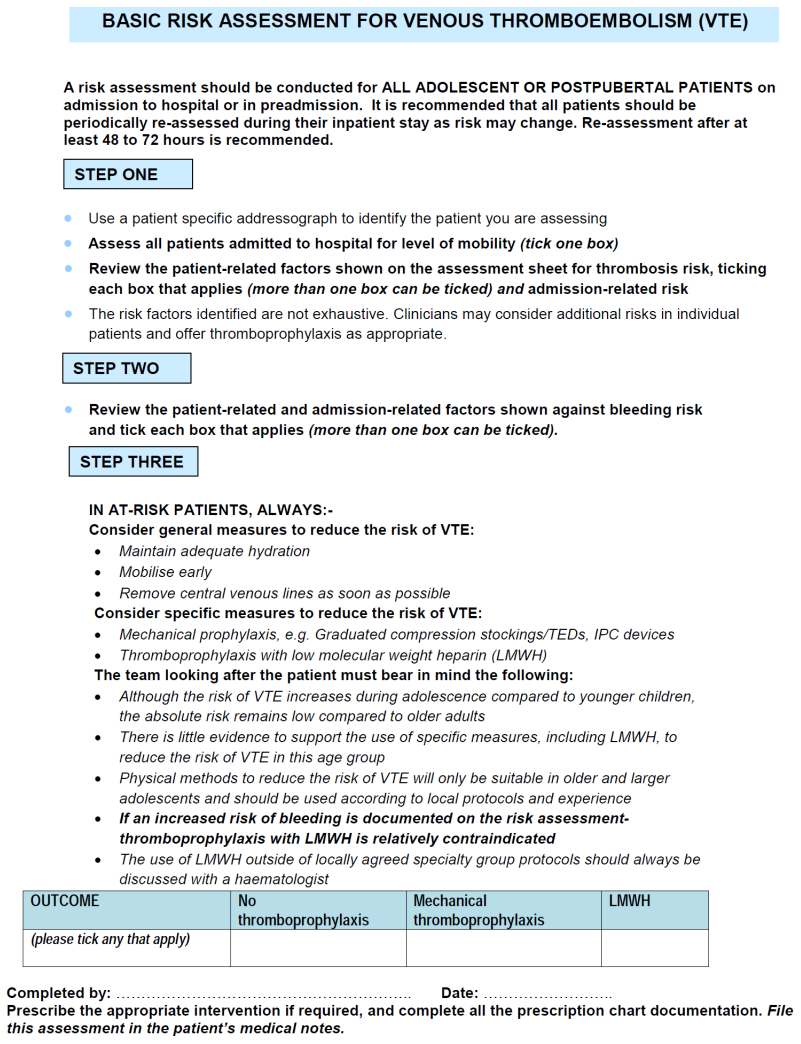 Appendix 1: Adolescent Risk Assessment for VTE