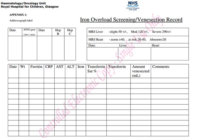 - Send FBC, reticulocytes, U&Es, LFT’s, serum iron, transferrin, transferrin saturation, ferritin, CRP and document these in the iron overload screening chart (see Appendix 1)