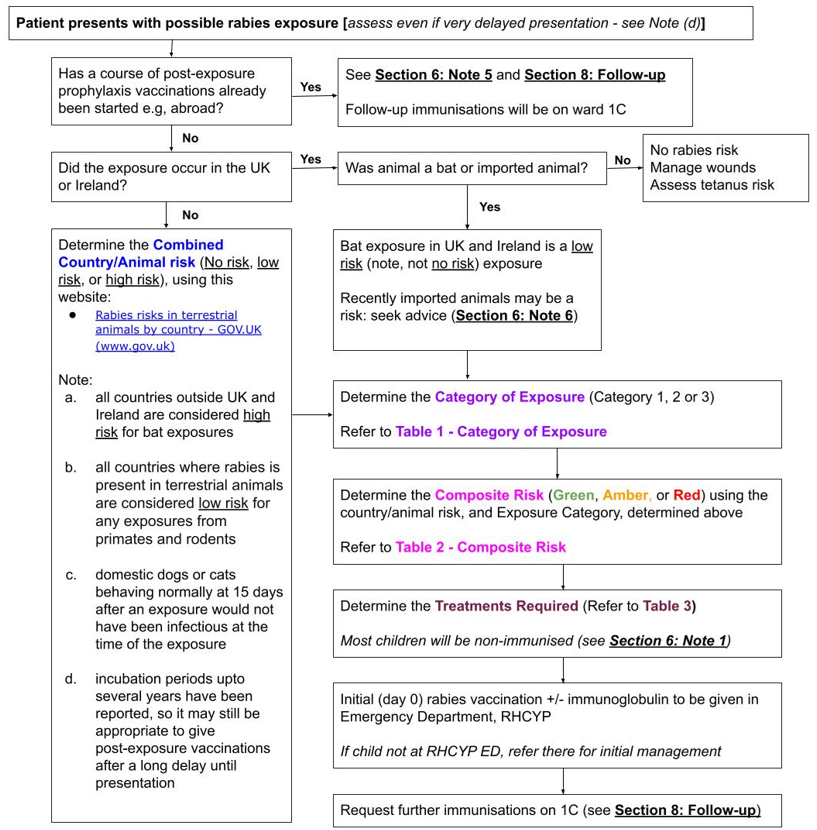Animals recently imported into the UK may pose a rabies risk. If the animal is in a facility (e.g, zoo), discuss with the responsible veterinary surgeon to determine the risk. If suspicion of illegally imported animal (e.g, domestic dog), discuss with paediatric infectious diseases team.