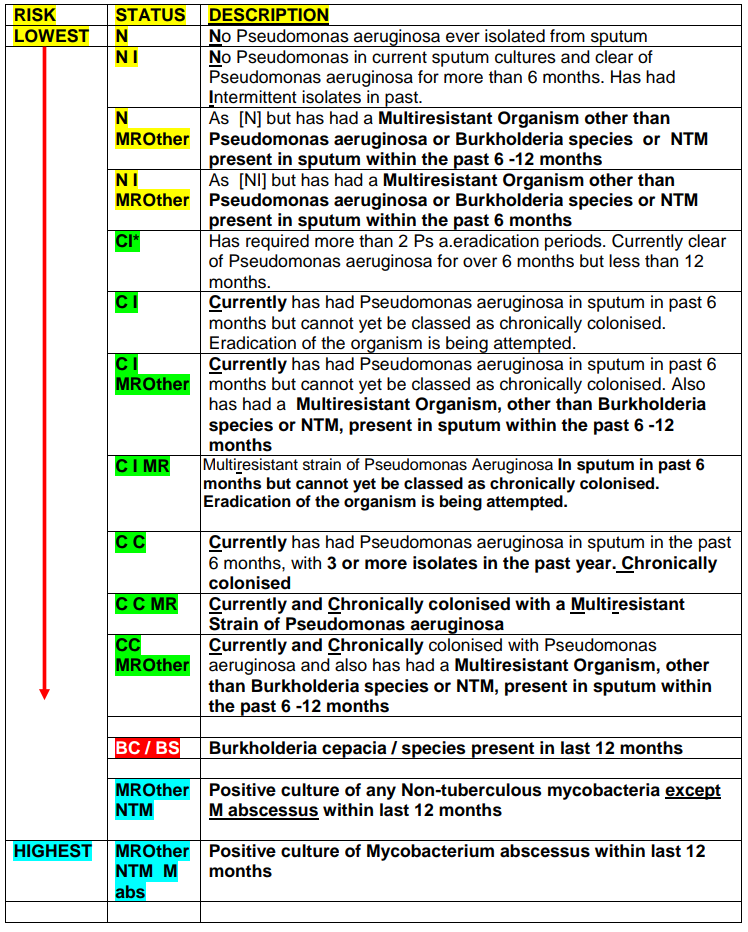 The GGC IPC Team has produced SOPs relating to CF patients attending RHC Inpatient and Outpatient departments. While adherence to the IPC advice in these SOPs allows for most CF patients to be seen in any Microbiology status order, exceptions to this are shown in the Table below which highlights the most significant pathogenic CF organisms.