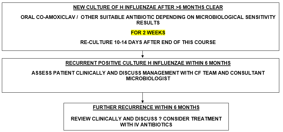 The role of Haemophilus influenzae in the progression of CF lung disease is not well elucidated with recent studies however it has long been recognised as a pathogen with guidelines including NICE recommending 2-4 weeks of treatment orally on first isolation:
