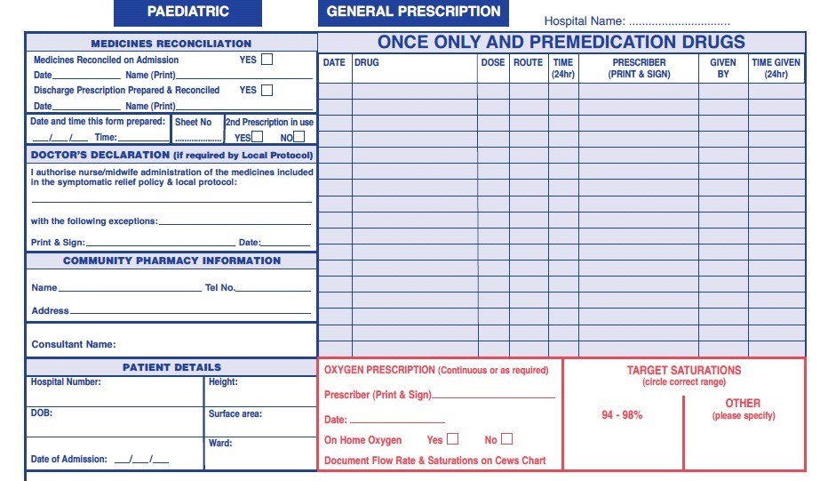 An oxygen section on the drug chart has been designed to assist prescription and administration. Oxygen should be prescribed by a doctor in the designated section of the hospital prescription card and the appropriate target saturation should be circled on the chart.