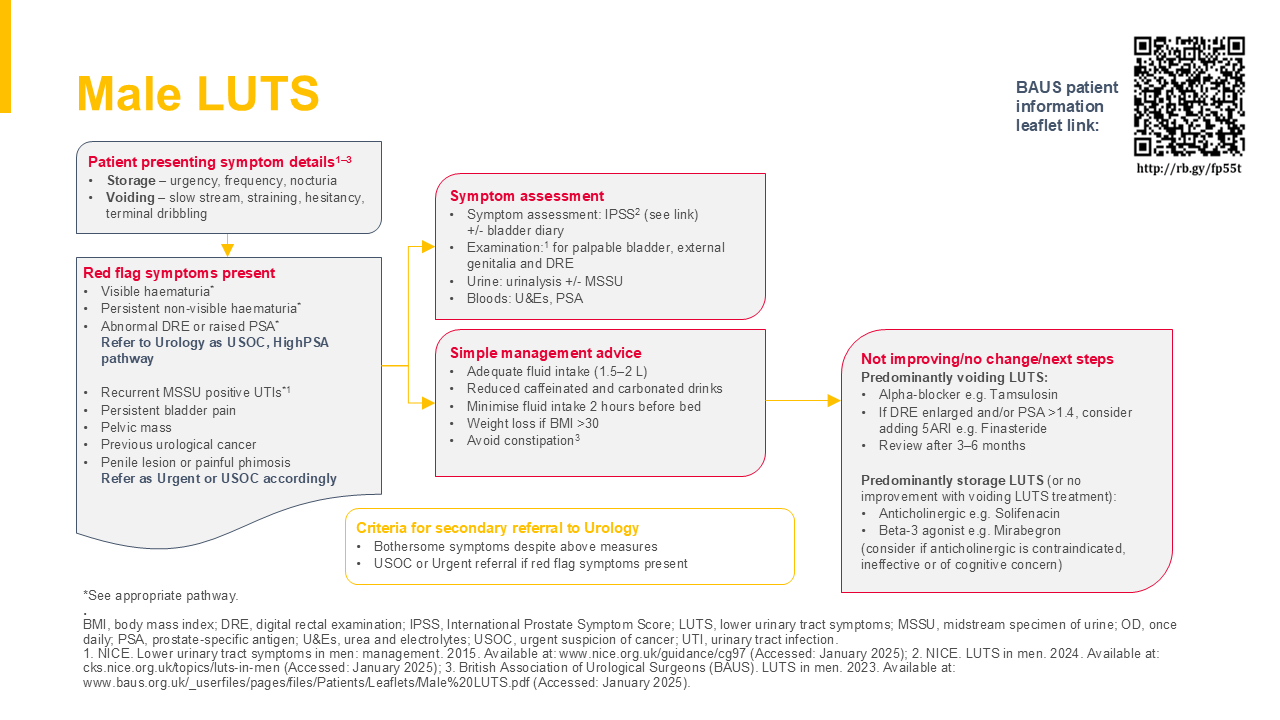 - British Association of Urological Surgeons (BAUS). LUTS in men. 2023. Available at: www.baus.org.uk/_userfiles/pages/files/Patients/Leaflets/Male%20LUTS.pdf (Accessed: January 2025)