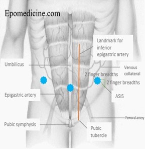 - The usual site for paracentesis is the left side but can be in either iliac fossa at least 10cm from midline or suprapubically (must ensure bladder is empty). The chosen site should avoid: distended bowel or bladder and inferior epigastric arteries. Guided by ultrasound marking if trained.
