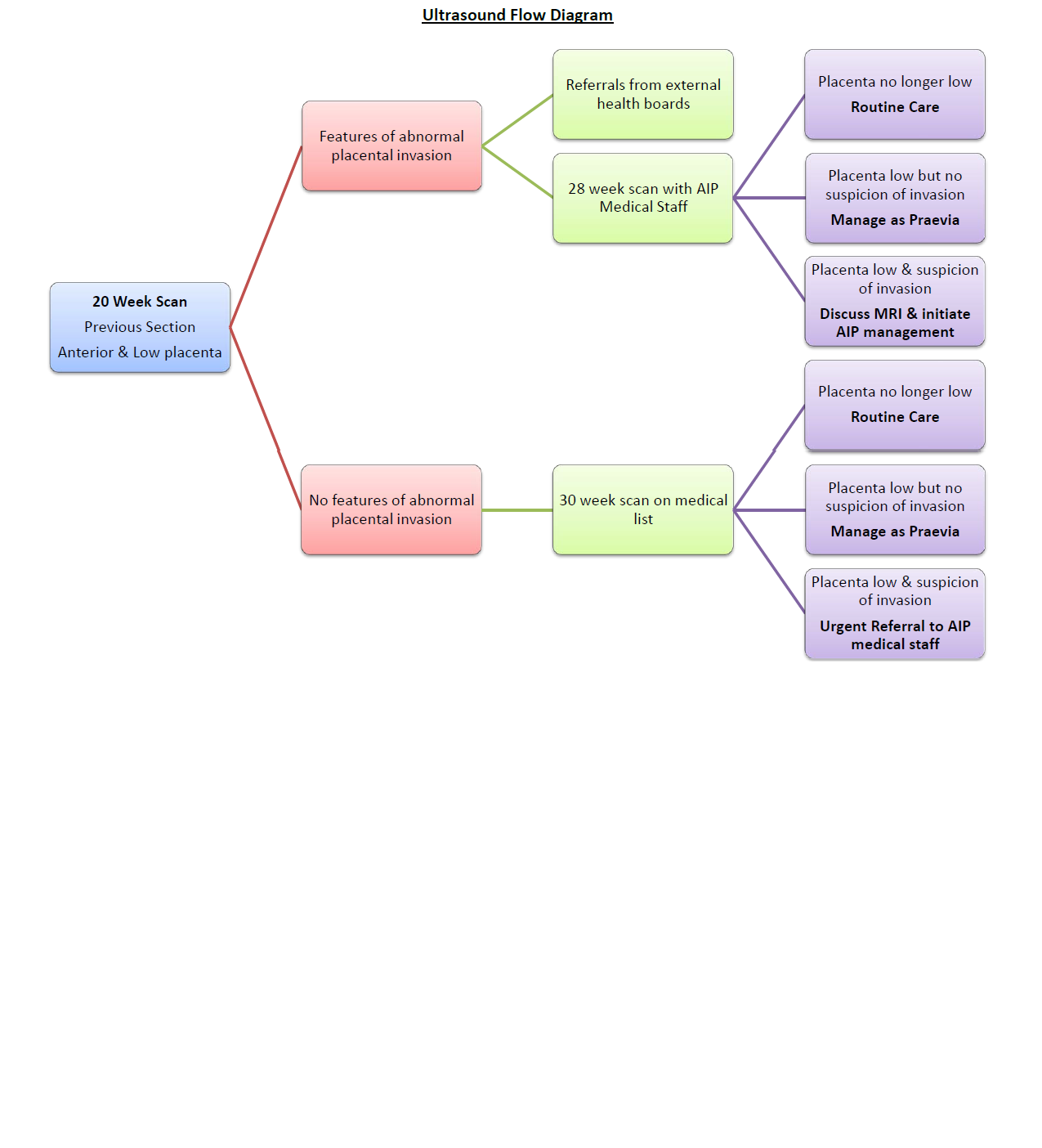It is anticipated that referrals from external health boards may present at this stage. These women should have been scanned by a medical sonographer in their own unit and be referred directly to one of the AIP consultants at around 30 weeks. One of the AIP medical staff will then arrange an ultrasound scan to assess their placenta.
