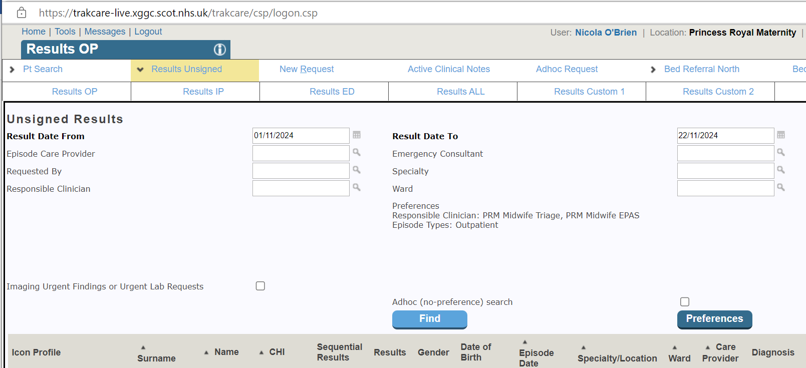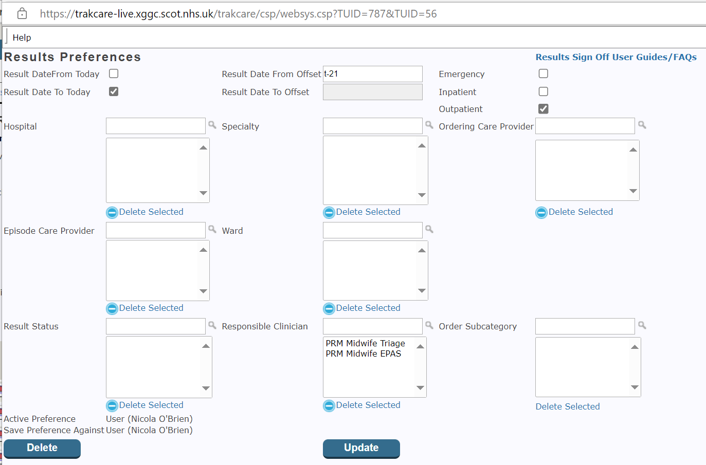 - In the results preferences page select your reviewing area (e.g PRM Midwife EPAS, QUEH Midwife Triage) under the ‘Responsible Clinician’ field and select ‘Update’.