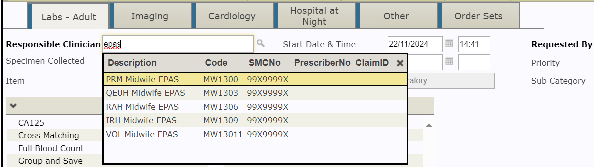 - Select ‘New Request’. Under responsible clinician, type your relevant area (either EPAS or Triage or DCU) and select your unit from the list (eg PRM Midwife triage, RAH Midwife EPAS)