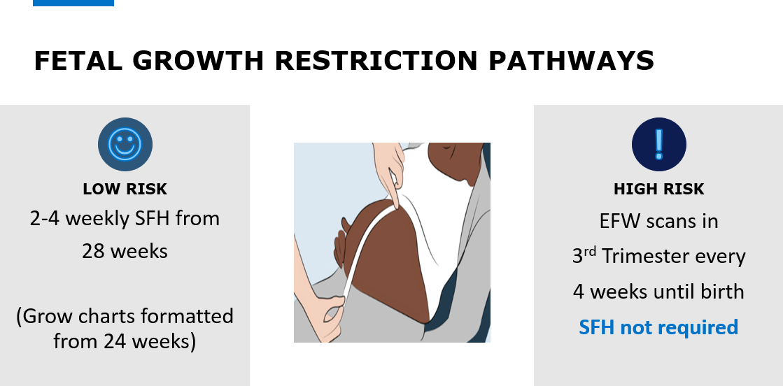 Pregnancies at higher risk of growth restriction should have ultrasound assessment of estimated fetal weight (EFW) four weekly from the third trimester until birth. If a patient is due to commence growth scans from 32wks then SFH should be measured at 28wks and patient referred for scan if <10th or >97th. Further SFH measurements will then not be required.