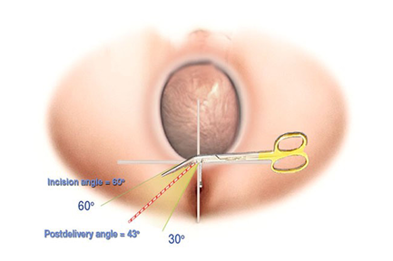 - At the height of a contraction, make an incision 4-5cm directed towards the ischial tuberosity, at a 60-degree angle (8 o’clock)