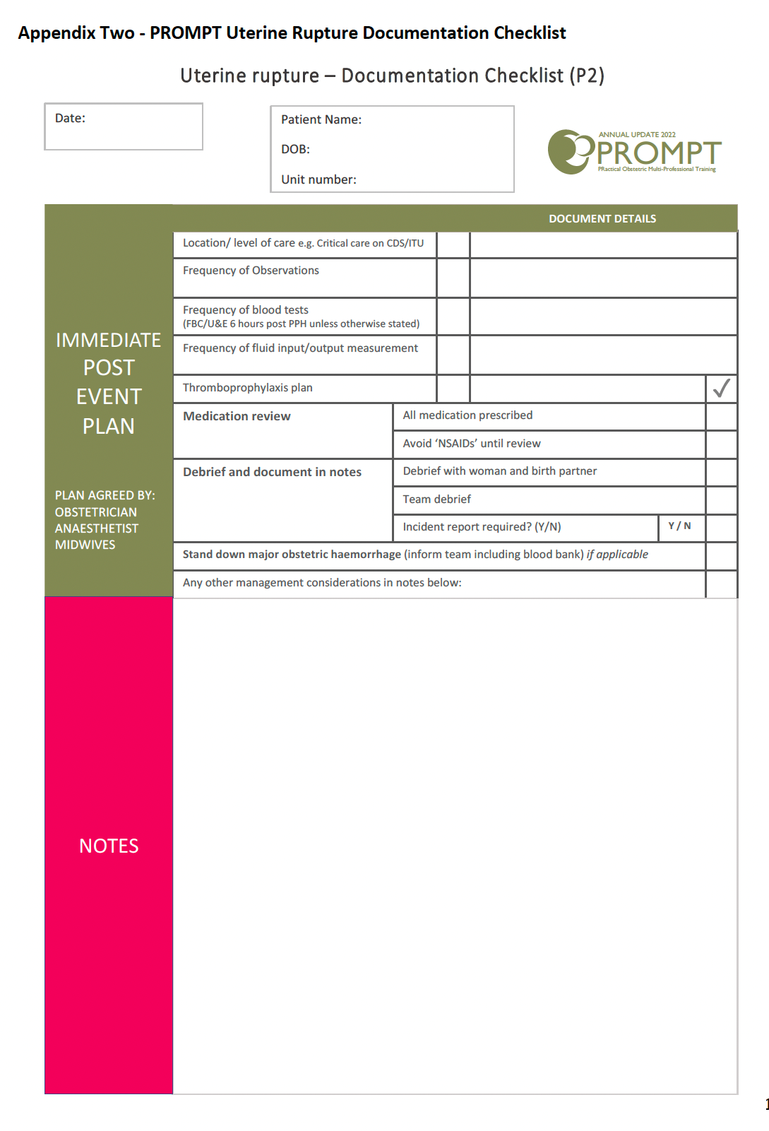 - Detailed postnatal plan should be documented immediately to include place of care – obstetric HDU/ ITU, fluids, analgesia, antibiotics, VTE prophylaxis and catheter care