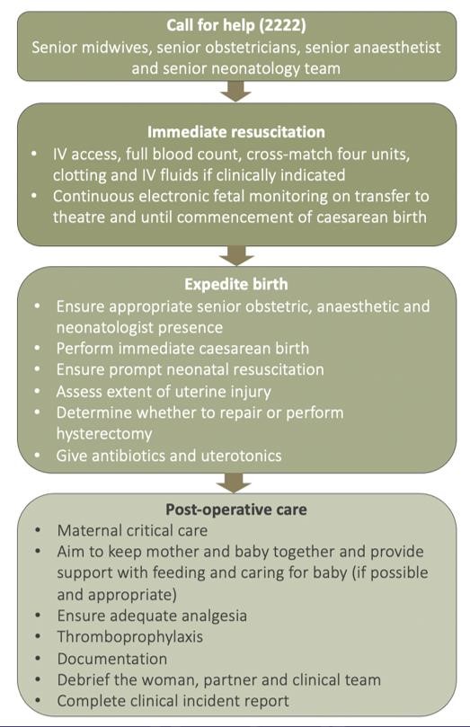 - Repair of the rupture can be performed unless the severity of rupture or haemorrhage warrants a hysterectomy. In complex situation, consultant obstetrician presence in the theatre is required. Second consultant or gynaecologist presence may be needed and should be planned early. Manual pressure can be used to control bleeding until help arrives.
