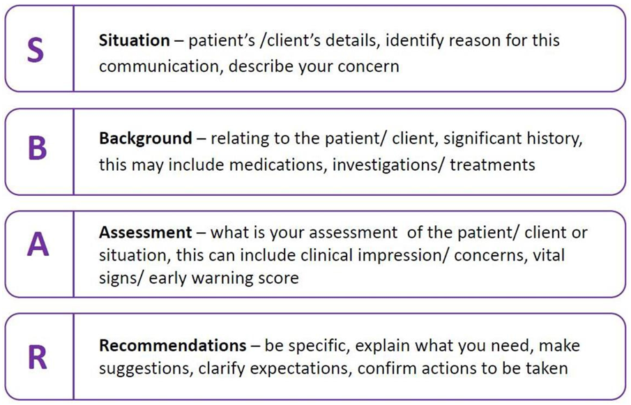 The SBAR communication tool is designed to structure information sharing between healthcare professions (NHSE&I 2021).