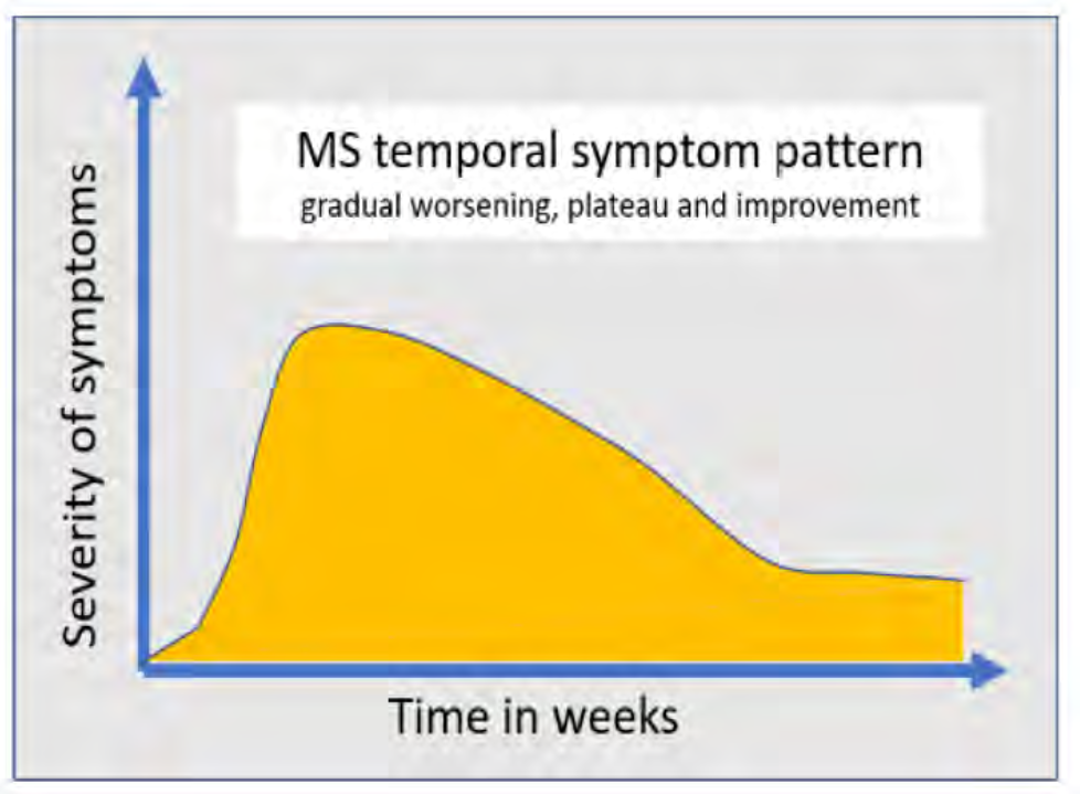 Clinical MS inflammation (relapse) typically presents with a specific focal symptom evolving over hours to days (rarely stroke–like), persisting for days to weeks, then gradually resolving, often completely. Relapses are not characterised by numerous, non-focal symptoms waxing and waning over long periods of time.
