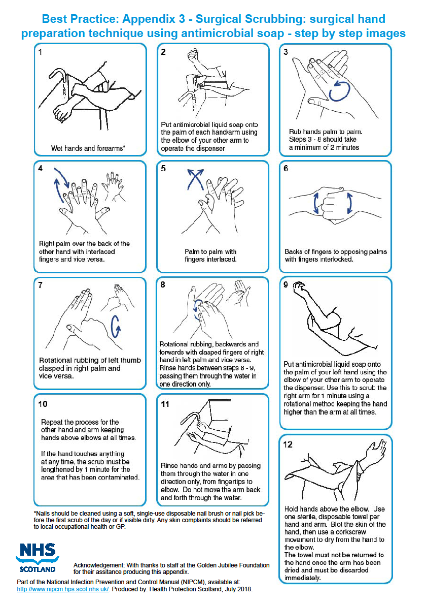 - Thorough hand-washing using a surgical scrub technique and drying with sterile towels.