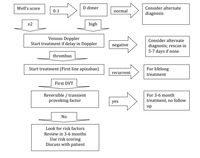 If D-Dimer positive without any other possible cause: Discharge home, and review in 1 week for possible repeat Doppler ultrasound. Decide on interim anticoagulation case by case. If D-Dimer result negative: DVT unlikely, consider alternative diagnosis and discharge. |