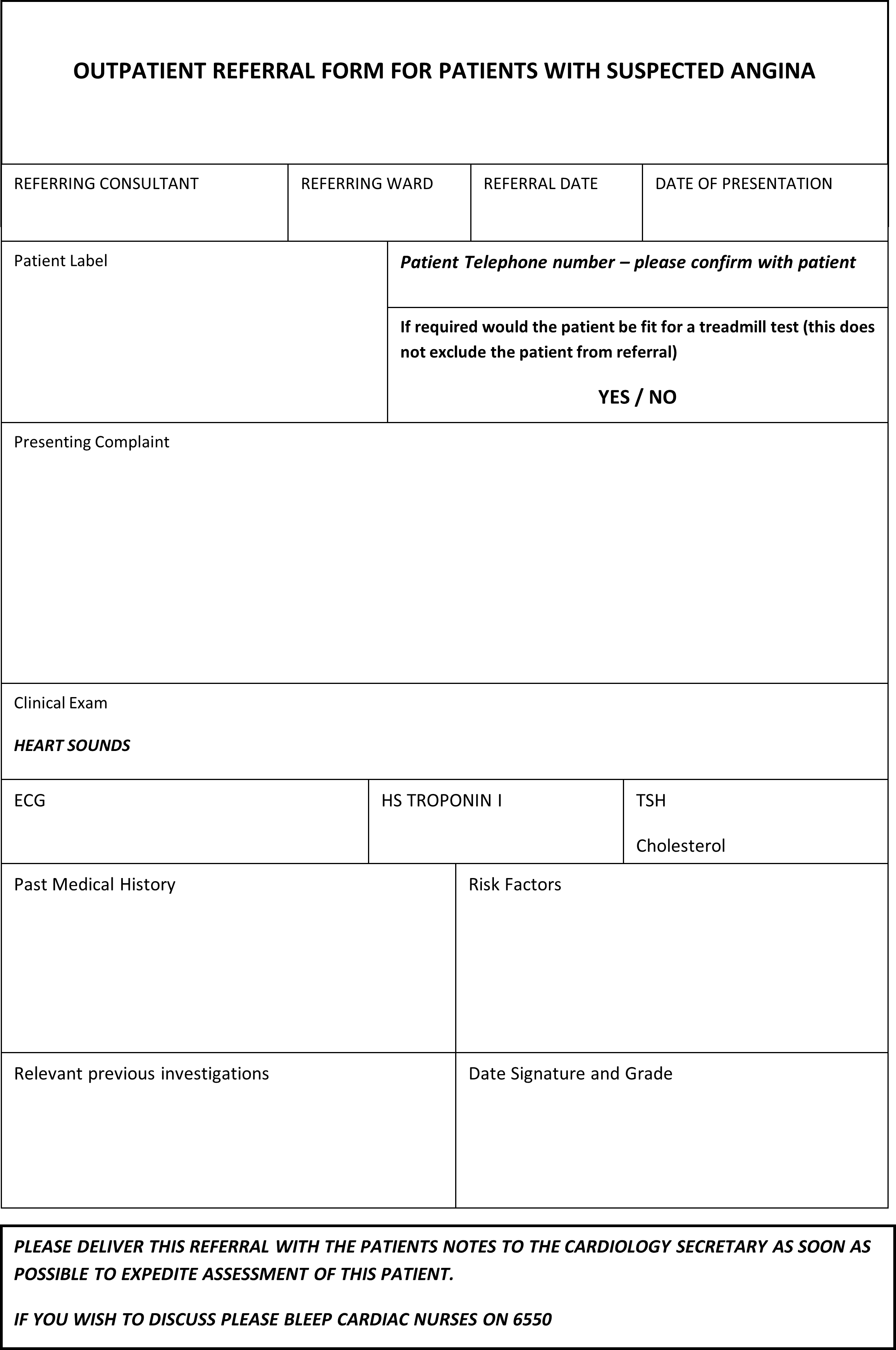 Give notes with referral sheet to ED secretary who will deliver to Cardiology team to follow up within 72 hours Within office hours bleep 6550 if advice required. |