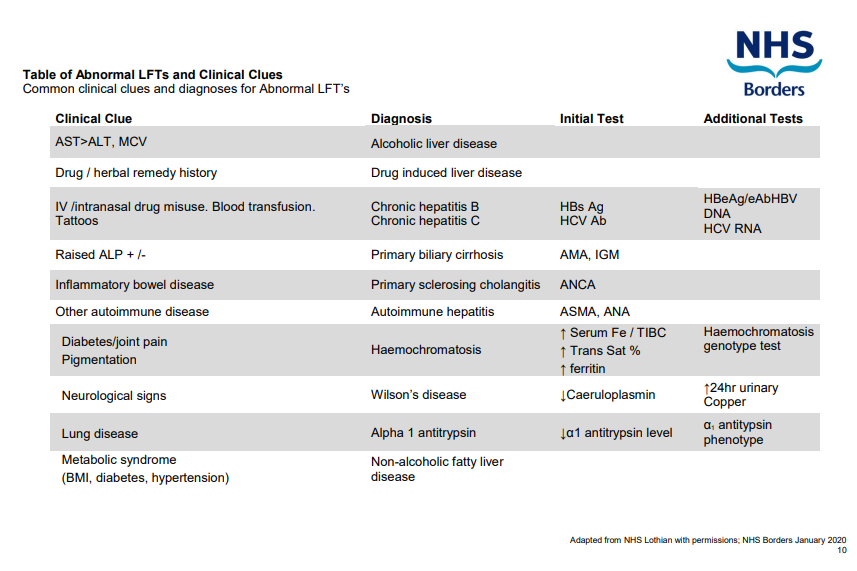- ALT 50-70 with an abnormal GGT/ALP (if isolated ALT 50-70 check Hep B&C serology only)