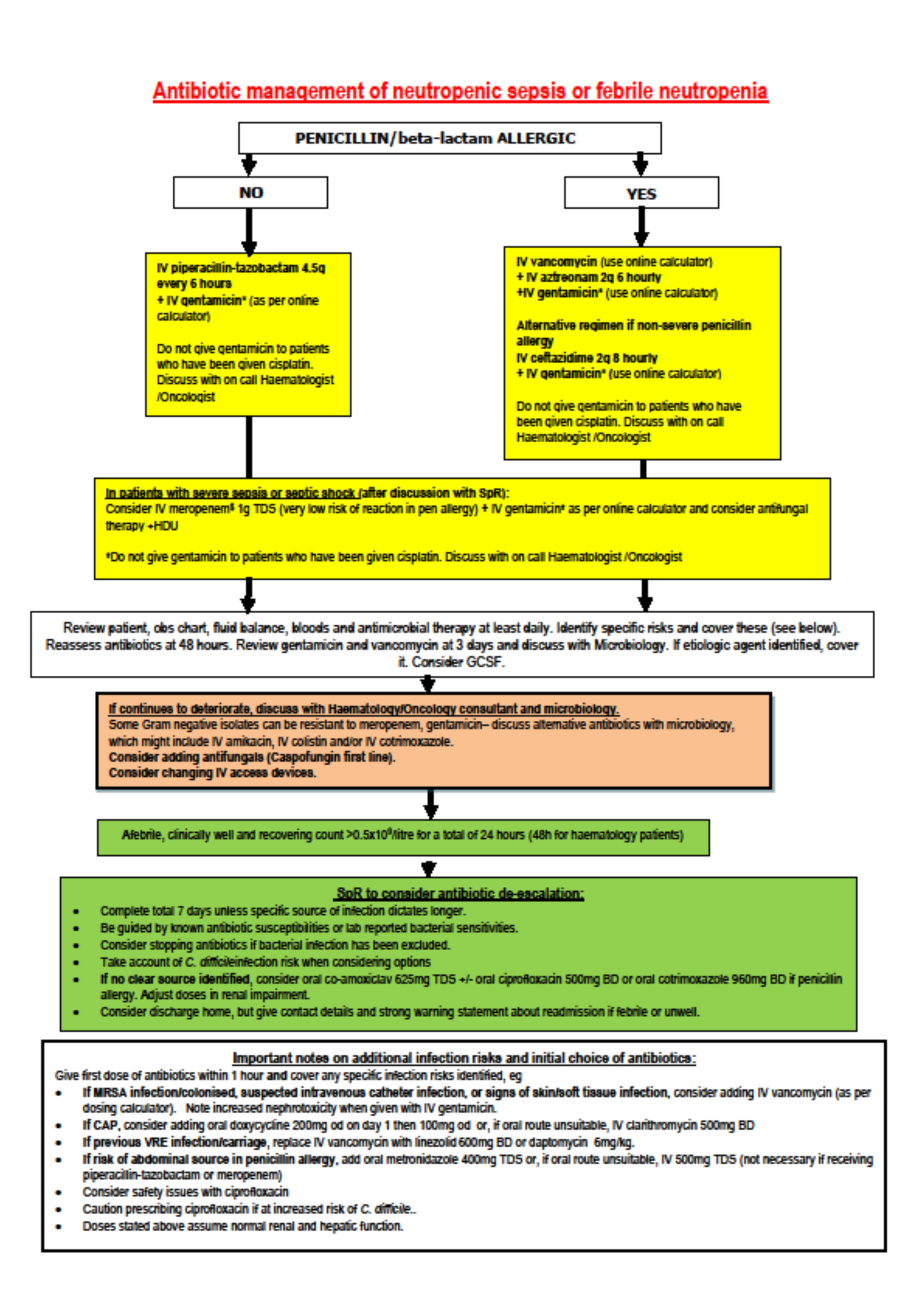 - Administer stat IV antibiotics within 1 hour First doses can be given on basis of last known eGFR . Do not give gentamicin to patients who have been given cisplatin. Discuss with on call Haematologist /Oncologist