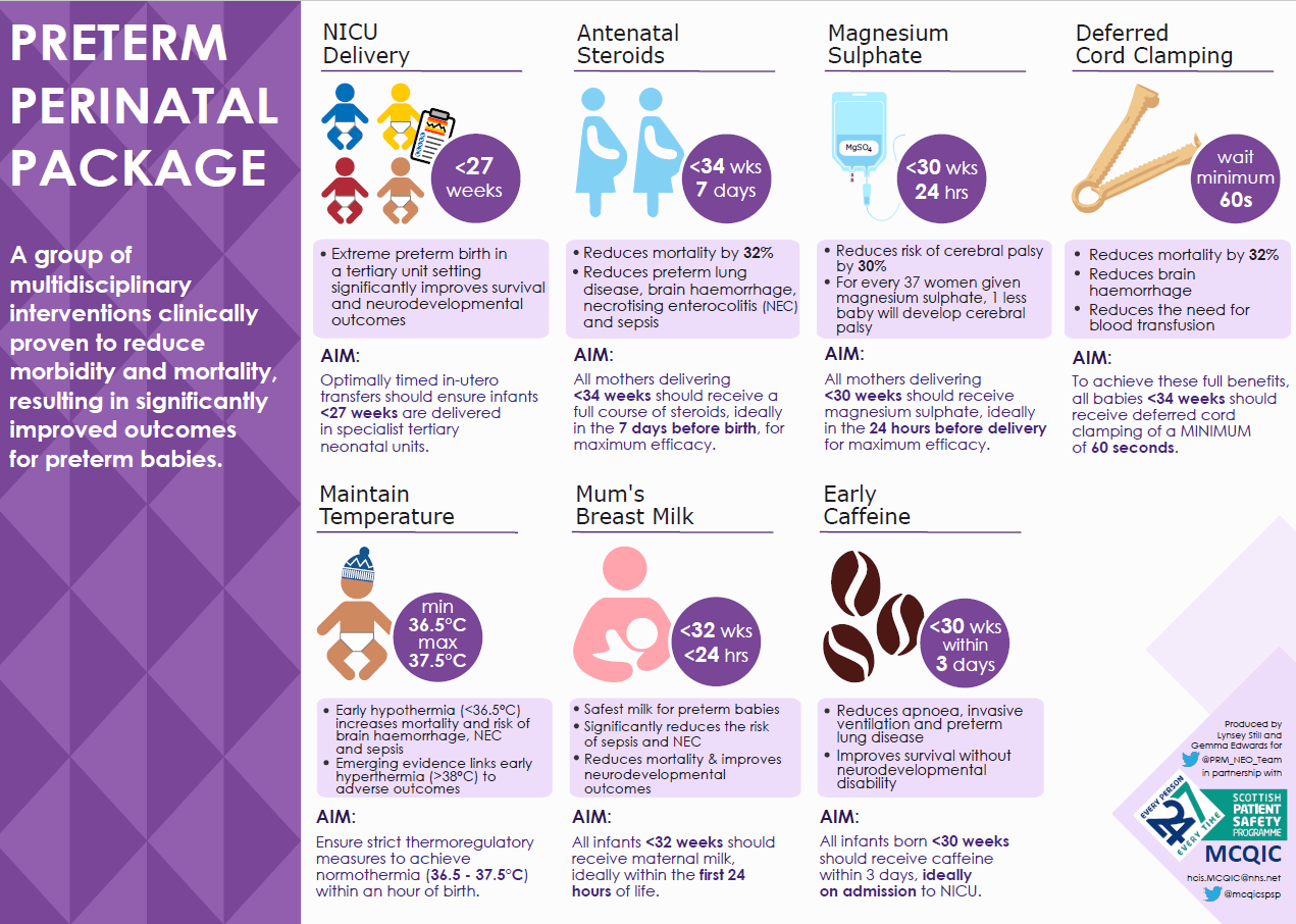There are 4 maternity-led strategies that should be offered/considered dependent on gestation to reduce mortality and morbidity in cases of preterm labour and planned preterm birth. See below sections for detailed guidance on each. These form part of the Scottish Patient Safety Programme (SPSP) perinatal optimisation package.