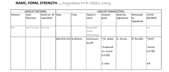 If the error or omission is traced, the registered nurse, midwife or ODP in charge should make an entry in the CD Record Book clearly stating the reason for the entry and the corrected balance. This entry must be witnessed by a second nurse, midwife, ODP, pharmacist, pharmacy technician or doctor. Both persons must sign the CD Record Book.