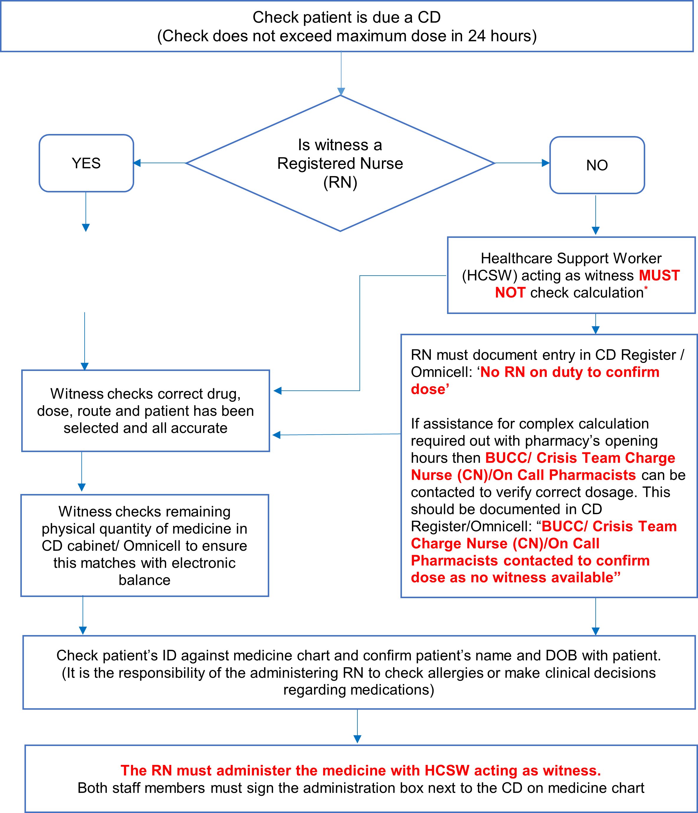 Two RN’s to administer CD’s is always the preferred option. When there is not another RN on duty however, using a trained HCSW is considered to be a safer option than a single nurse check.