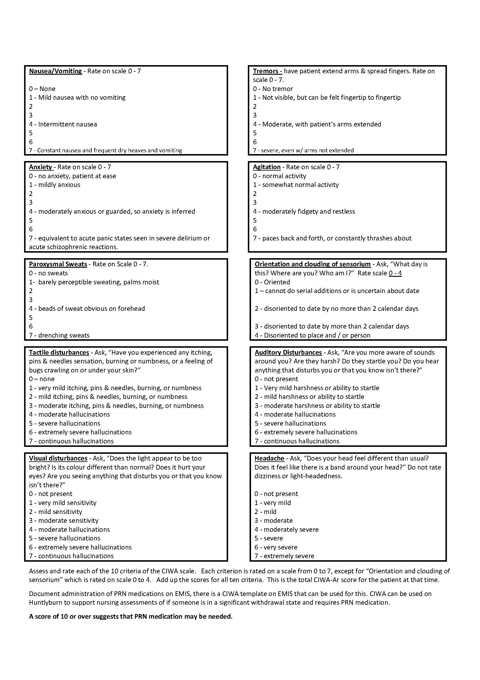 Alongside the fixed reduction, as required (PRN) chlordiazepoxide should be prescribed, with a maximum of 250 mg daily (including regular). If there is evidence of particularly severe withdrawal symptoms, discuss this with a senior doctor in BAS who may request this be increased to a maximum dose of 300 mg daily, or higher if appropriate, as well as considering any other management steps. Patients can request PRN doses from nursing staff if they are experiencing withdrawal symptoms, or these may be actively offered by nursing staff if they observe evidence of withdrawal. Nursing staff must use the Clinical Institute Withdrawal Assessment for Alcohol (CIWA - Ar) scoring to help them judge the severity of withdrawal that a patient is experiencing and to guide if PRN doses are needed (Appendix 3), a score of 10 or over generally indicates that a PRN should be given. CIWA score must be recorded in the notes prior to administration of any PRN doses and again 1hr after administration of the PRN dose.
