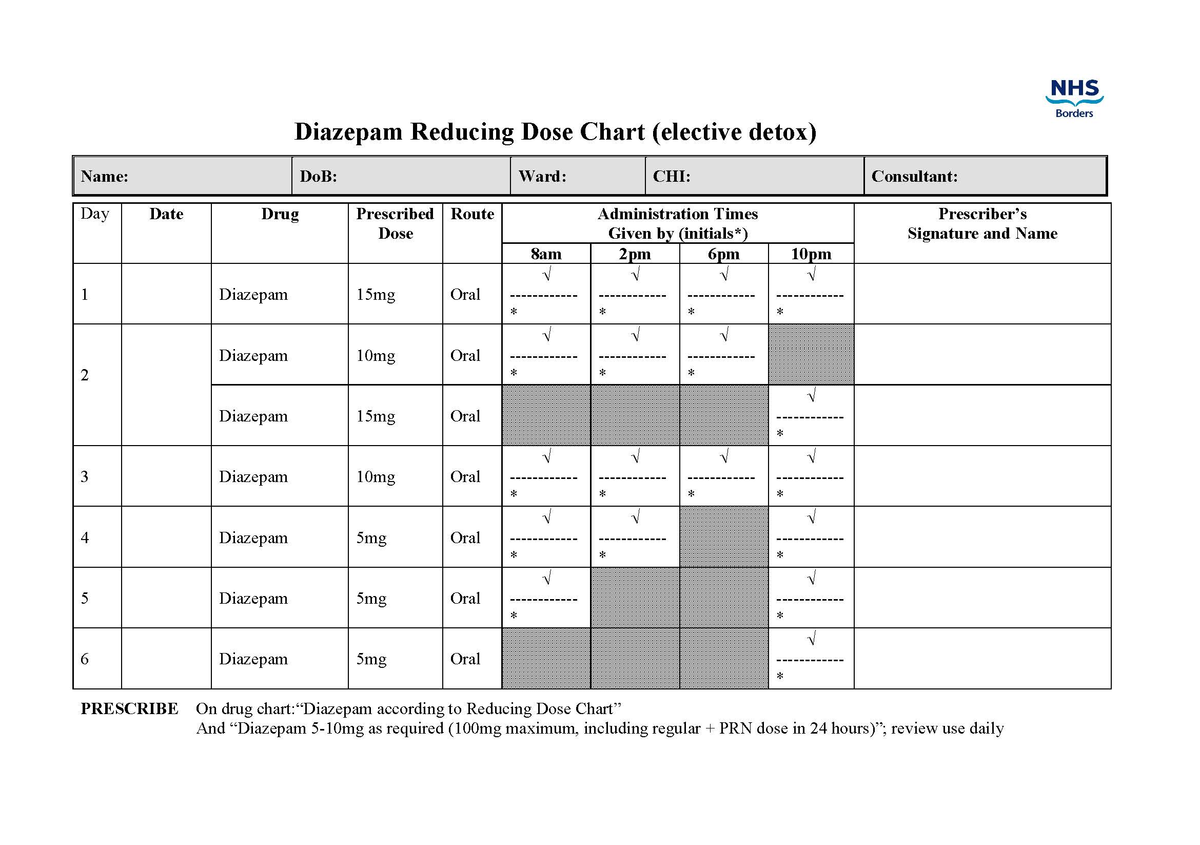 Diazepam can be used as an alternative to Chlordiazepoxide. It has a longer half-life than Chlordiazepoxide and can be more prone to accumulation and toxicity. It should only be used in place of Chlordiazepoxide where this has been specially requested by BAS. It should not be used where there is severe liver impairment. Diazepam 5 mg is approximately equivalent to 12.5 mg of Chlordiazepoxide. In addition to the reduction regime in Appendix 4 an as required dose of Diazepam 5 – 10 mg should be prescribed, total maximum of 100 mg in 24 hours.