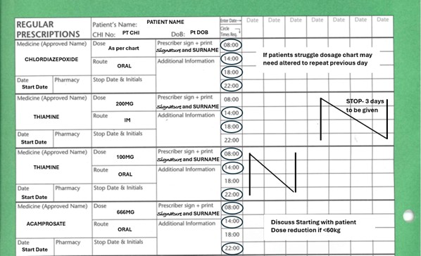 Some patients, especially at the start of the detox, may struggle and need to repeat a previous day, for example restarting and repeating day one (chlordiazepoxide 30 mg QDS) the day following admission. There should be a low threshold for doing this, alongside allowing more liberal usage of PRN in the first 3 days. This is the highest risk period of the detox and more liberal chlordiazepoxide use lowers the risk of seizures or delirium tremens (DT’s) developing.