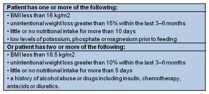 Consider whether there is a risk of refeeding syndrome (see table below). If ‘high risk’ of refeeding syndrome: