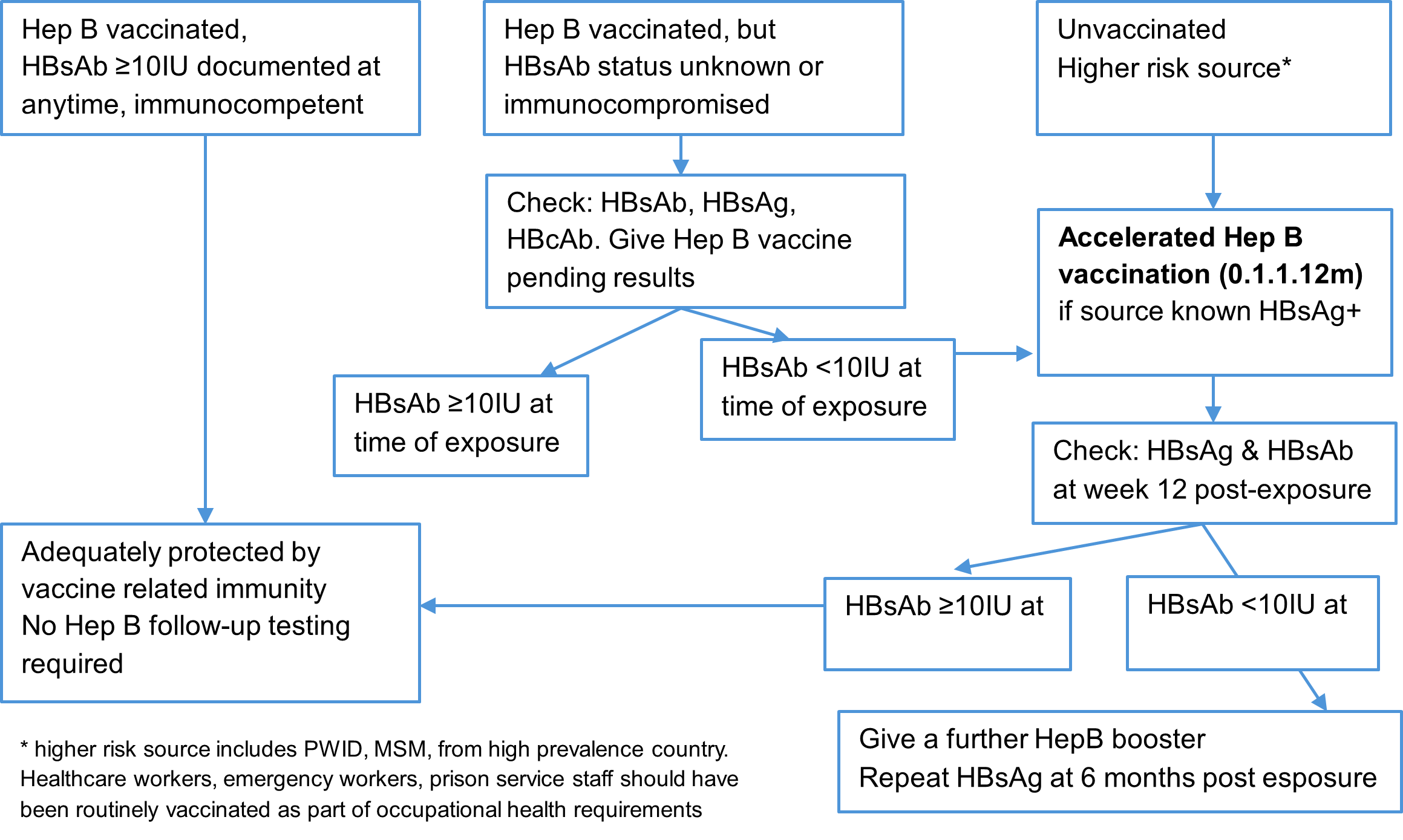 *High prevalence countries or risk-groups are those where there is a significant likelihood of the index case individual being HIV positive and not taking effective treatment (in most cases this equates to being undiagnosed). Within the UK at present, this is likely to be MSM (men who have sex with men), people who inject drugs from high-risk countries and individuals who have immigrated to the UK from areas of high HIV prevalence, particularly sub-Saharan Africa (high prevalence is >1%). HIV prevalence country specific HIV prevalence can be found at https://aidsinfo.unaids.org ** If patient HIV positive and undetectable the same evidence base for U=U does not exist for non-sexual exposures although it remains unlikely that PEP would be indicated. |