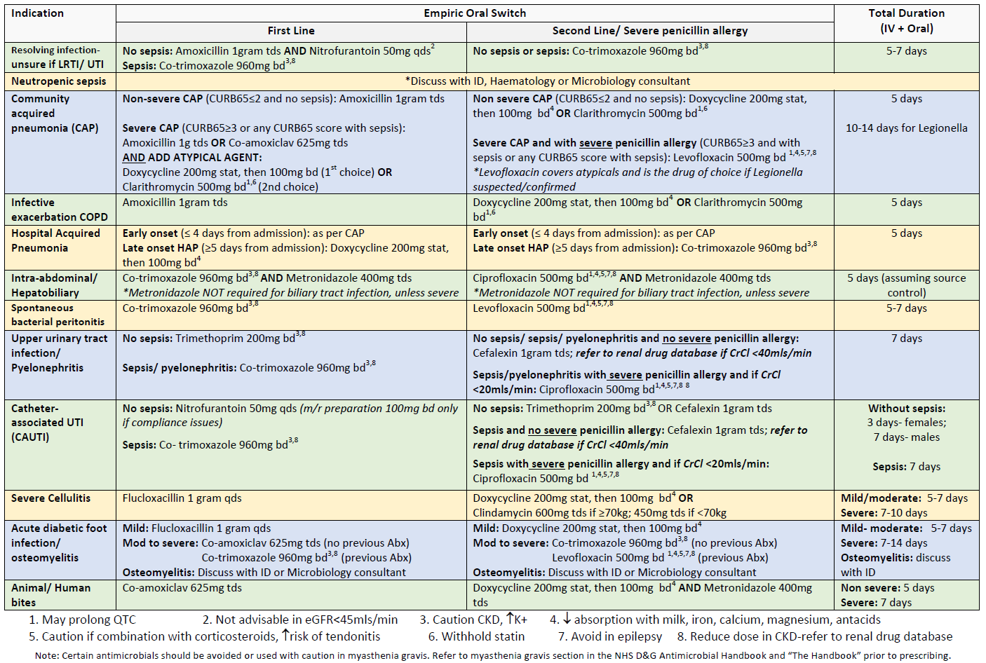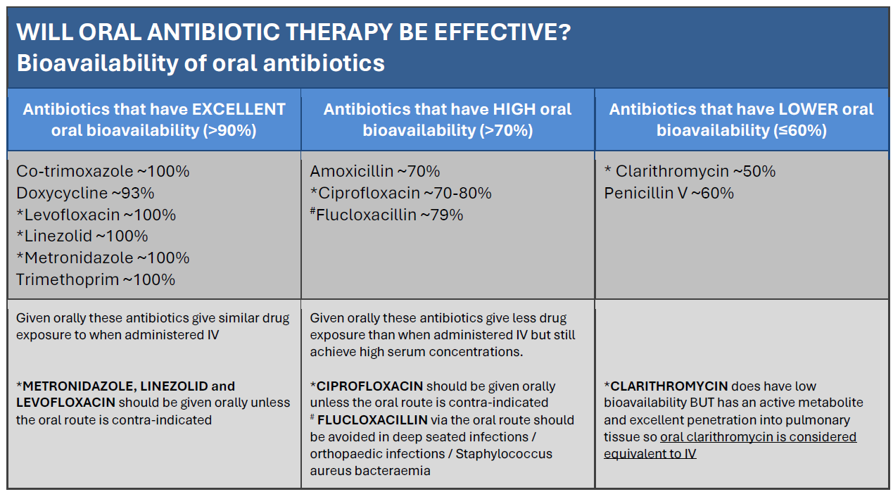 If antibiotic treatment is in line with Empirical Antibiotic Guidelines and there is no positive microbiology to guide the change, then select oral regimen as per table below.
