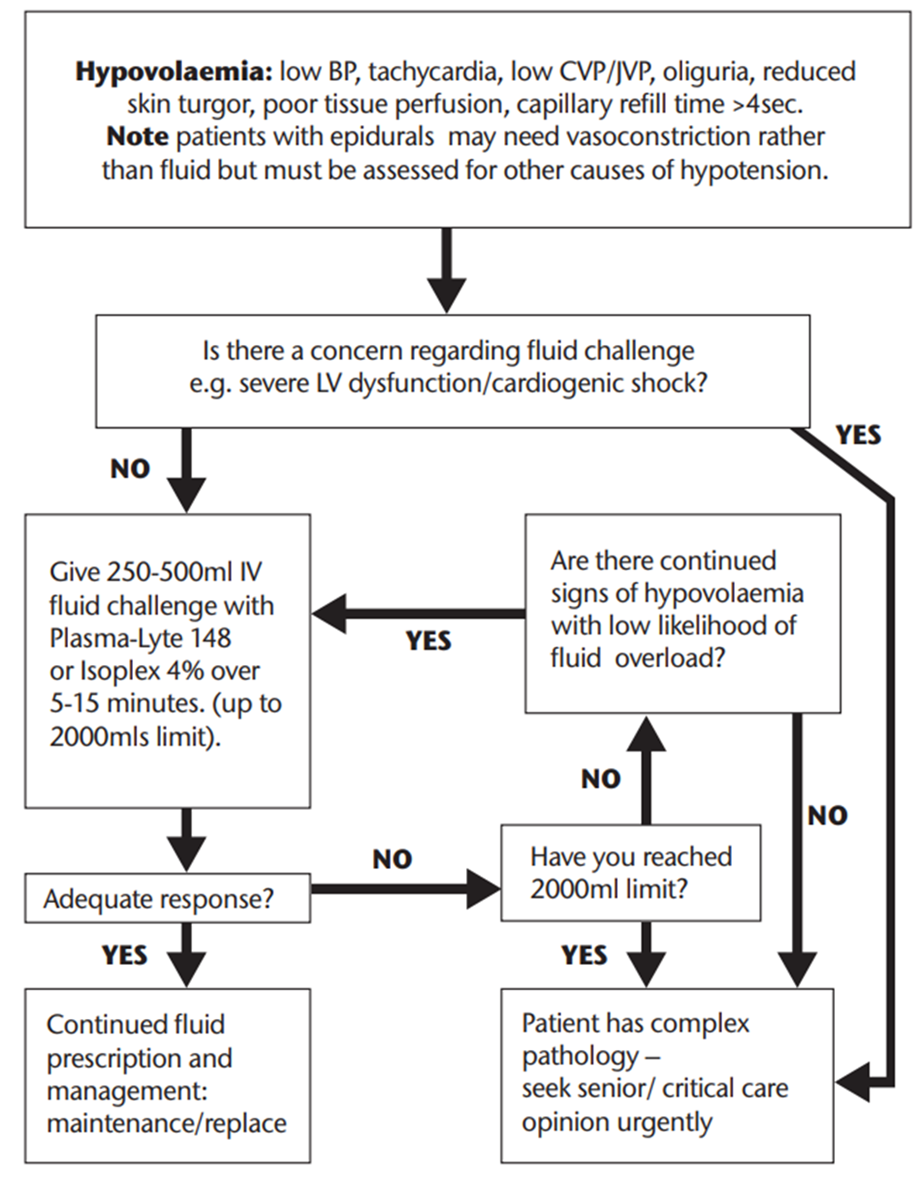 Hypovolaemic: Patient may have cool peripheries, respiratory rate>20, systolic BP<100mmHg NEWS>/=5, HR>90bpm, postural hypotension, oliguria and confusion. History of fluid loss or low intake. May respond to 45˚ passive leg raise. Consider urinary catheter in sick patients. However, signs of hypovolaemia may be unreliable in elderly patients.