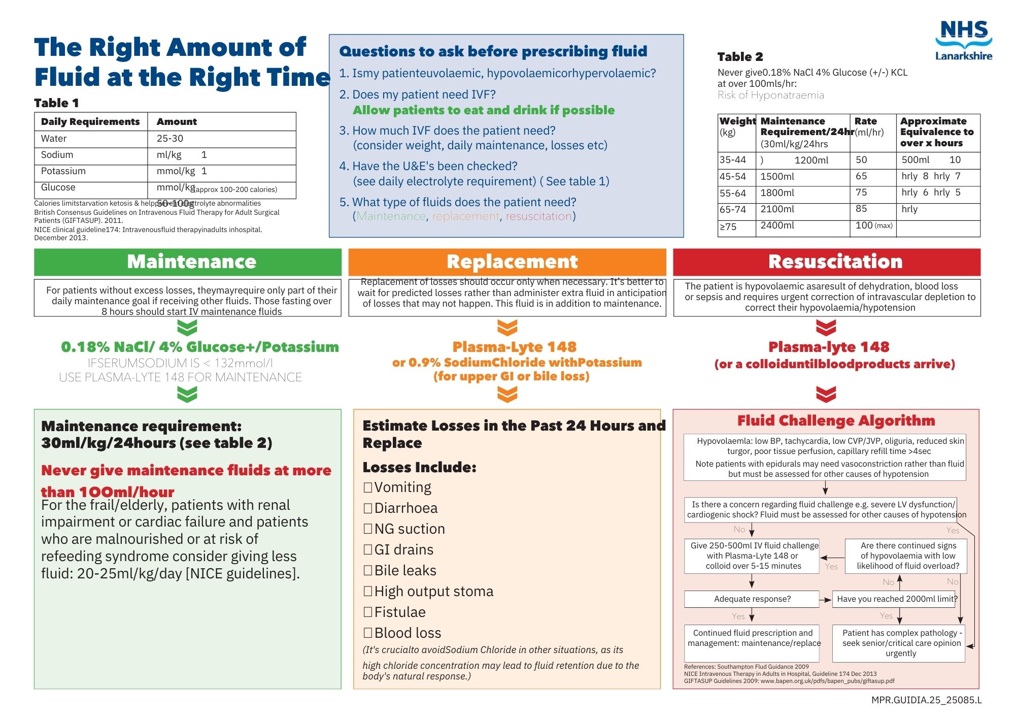Preferred maintenance fluids: 0.18% Sodium Chloride 4% Glucose with or without added potassium 40mmol in a litre or Maintelyte. This fluid if given at the correct rate (Table 1) provides all water and Na+/K+ requirements until the patient can eat and drink or be fed. Excess volumes of this fluid (or any fluid) may cause hyponatraemia.