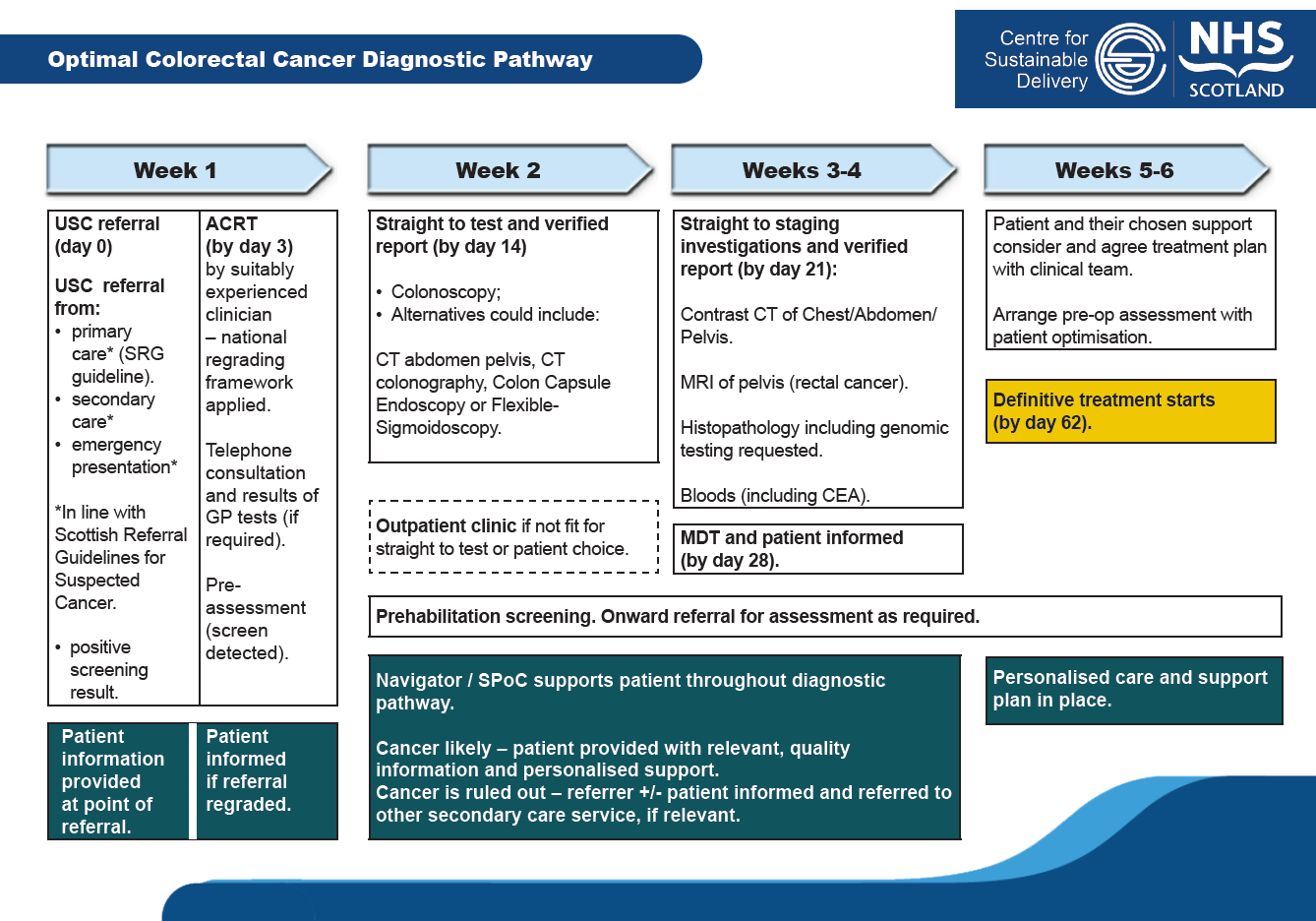 Including as much relevant information and supporting materials in the initial referral from primary care is key to enabling active clinical triage to ensure the patient is on the right pathway at the right time. As per the Scottish Referral Guideline, if lower gastrointestinal cancer is suspected: